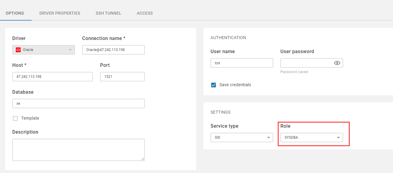 解决方案: 连接信息中的 role 选择为 SYSDBA or SYSOPER