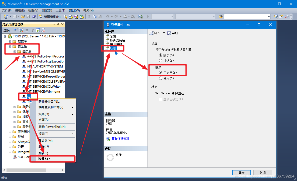 打开SQLServer企业管理器工具,在服务器连接属性中,勾选允许远程连接到本服务器
